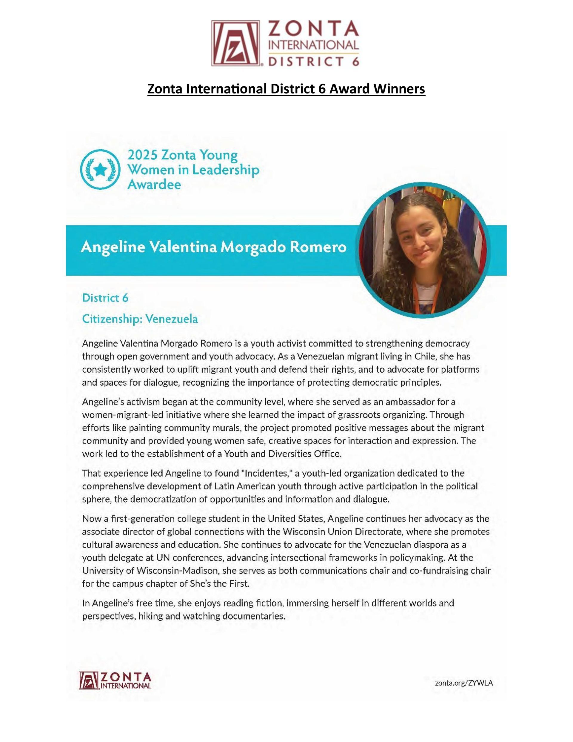 Now a first-generation college student in the United States, Angeline continues her advocacy as the associate director of global connections with the Wisconsin Union Directorate, where she promotes cultural awareness and education. She continues to advocate for the Venezuelan diaspora as a youth delegate at UN conferences, advancing intersectional frameworks in policymaking. At the University of Wisconsin-Madison, she serves as both communications chair and co-fundraising chair for the campus chapter of She's the First.