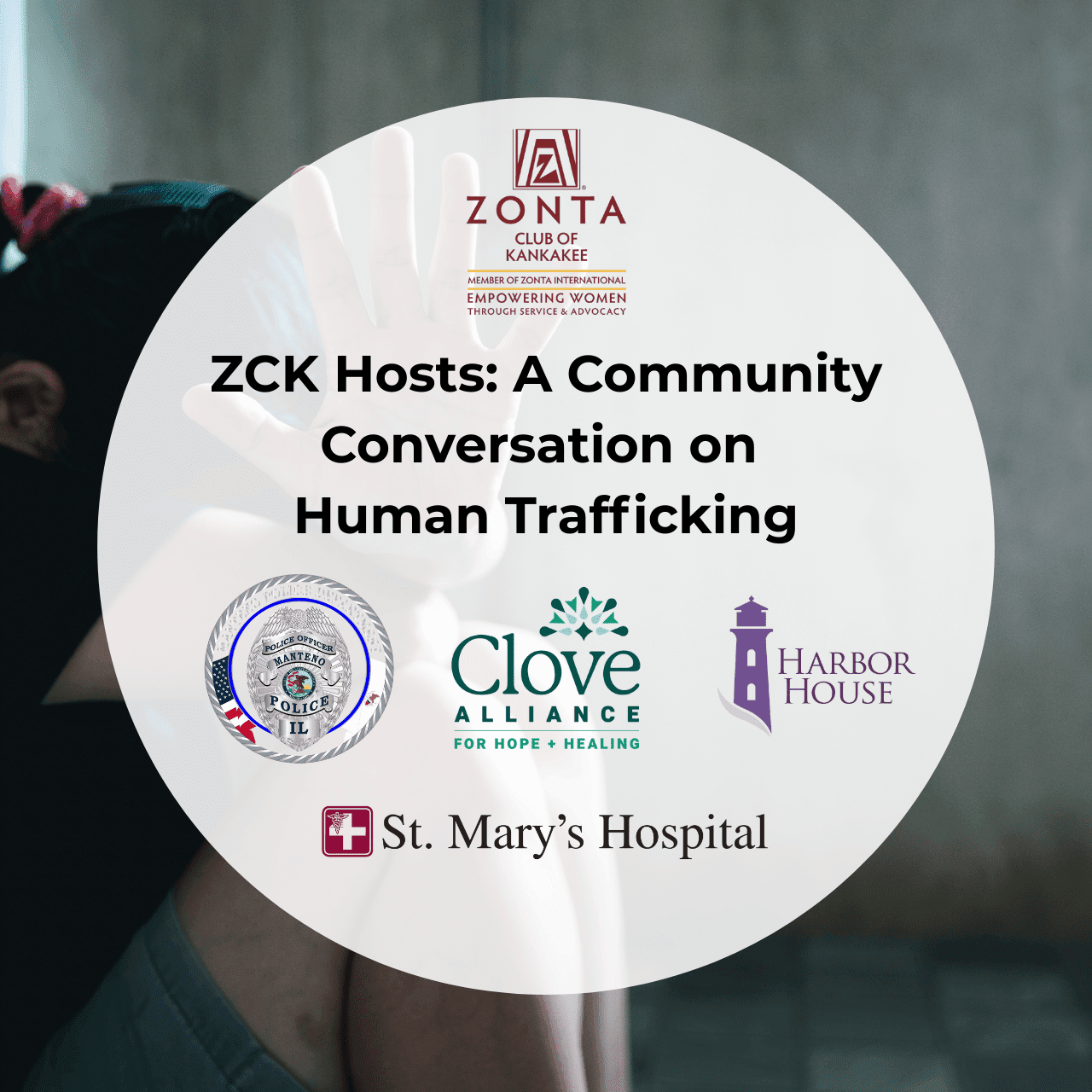 Join us for a virtual roundtable discussion focused on understanding human trafficking and how it impacts our communities. This conversation will bring together professionals from advocacy, healthcare, and law enforcement to share insights, answer common questions, and discuss how individuals and organizations can better recognize and respond to trafficking. Featured panelists include Jayden Anderson-Baker, CDVP, Development Director at Harbor House; Ashley Villarreal, Director of Community Engagement at Clove Alliance; Detective Sean Prophet at Manteno Police Department; and Brook Coutant, RN at St. Mary's Hospital. The discussion will be moderated by Janice Krizik-Schmidt, Zonta Club of Kankakee Board Director and Advocacy Committee member. This session is designed to provide practical, surface-level information for community members, advocates, and service providers who want to better understand the realities of human trafficking and the role we all play in prevention and response.