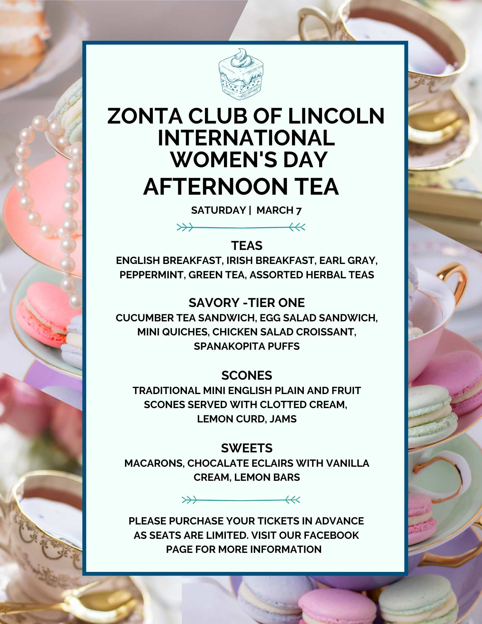 The Zonta Club of Lincoln invites you to an Afternoon Tea on Saturday, March 7 from 1-3 pm at the First Presbyterian Church in Lincoln, IL.